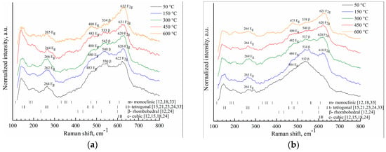 The Raman spectra of ScSZ and ScSZAl are of a similar shape; however, the intensities of peaks at 620 cm−1 are lower for the ScSZAl thin films (Figure 4). In the case of thin films with an Al dopant (Figure 4b), the cubic phase begins to form at a temperature higher than 50 °C and further increase of the temperature does not significantly influence the amount of the cubic phase. This means that Al slows down the cubic phase formation and stabilizes it at higher than 300 °C substrate temperatures. Quantitative calculations give the same substantiation (Table 2). The ratios of the cubic phase to the tetragonal and rhombohedral phases are from 42% to 53% for ScSZ and around 42% for ScSZAl. Calculations reveal that the amount of cubic phase increases by 10% for ScSZ and by 2% for ScSZAl with increasing substrate temperature. Finally, Raman analysis shows that thin films have a mixture of cubic (~44%), tetragonal (~18%), and rhombohedral (~38%) phases (Table 2). The obtained results demonstrat that a polymorphous transition from rhombohedral to cubic phase occurred in the formed thin films, indicating a typical behavior for the doped ZrO2 [39]. According to the XRD spectra, the ZrO2 rhombohedral phase is not significantly expressed and the tetragonal phase is not observed, while Raman spectra show large amounts of these phases, meaning that both phases could be located in the grain boundaries [15,39].