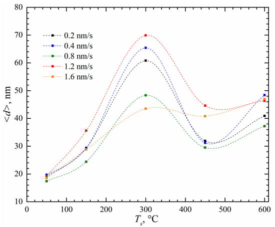 The average crystallite size dependence on the substrate temperature shows a nonlinear behavior (Figure 5). Crystallites grow larger (17.4–69.9 nm) with increasing substrate temperature (50–300 °C) during deposition. At 450 °C temperature, a sudden decrease of crystallite size occurs (~45–30 nm). This can be related to the changes in preferential orientation and to the changes in the ratio of phases. The preferential orientation changes from (200) at the temperatures up to 450 °C to (111) at high temperatures due to the higher diffusion energy of adatoms which allows them to move on the surface and become trapped on the high diffusivity surfaces.