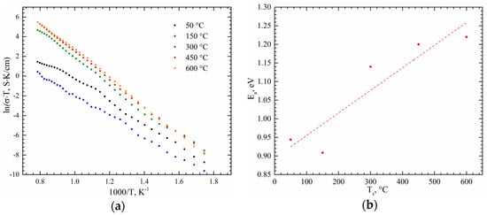 Arrhenius plots show linear dependences (Figure 6a). No obvious breaking or bending points were observed. This means that no phase transitions occurred during the measurements. Moreover, ionic conductivity (600 °C measurement temperature) is observed to be related to the substrate temperature (Table 3). Ionic conductivity is higher for the thin films deposited on higher temperature substrates. The highest value of ionic conductivity of 4.2 × 10−3 S/cm (substrate temperature 600 °C and deposition rate 0.4 nm/s) is similar to other authors’ results (~7 × 10−3 S/cm) [13,16,24]. Crystallite size has a similar dependence on temperature. Crystallites were observed to grow larger (17.4–69.9 nm) with increasing substrate temperature (50–300 °C) during deposition. At 450 °C, a sudden decrease of crystallite size occurs (~45–30 nm). This may be related to the changes in preferential orientation and to the changes in the ratio of phases. It is known that ionic conductivity is strongly related to crystallite size. According to the brick layer model, materials consisting of larger crystallites exhibit higher ionic conductivity because grain boundaries slow down oxygen ion diffusion [40,41,42].
