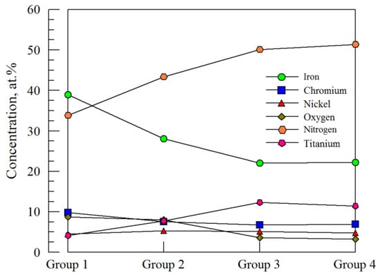 Average compositions of the deposited films within each group based on the results shown in Table 1. The increase in Ti correlates with the increase in nitrogen, which is due to the strong gettering effect of Ti for N.