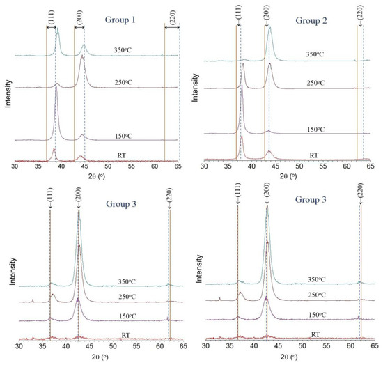 For samples in group 4 significantly weaker diffracting peaks were observed, despite having a similar thickness to films in groups 2 and 3, which suggests poor crystallinity or films with off-axis texture. In order to investigate this further, samples in this group were examined using the Bruker area-detector XRD system, and rocking curves were obtained for the (111) and (200) reflections. The results are shown in Figure 4, where ψ is the angle of tilt away from the film normal axis. Intensities in the (111) rocking curves were generally stronger than the (200). For the room temperature deposition, there is some (111) diffracted intensity near ψ = 0, but the strongest peaks are at ψ ~ 35°–40°. At 150 °C and 250 °C, the (111) reflections peak near ψ = 15°, which is close to the angle of gun tilt in the sputter deposition system. At 350 °C, the peaks are weaker and more diffuse, indicating a possible transition away from off-axis texture. The (200) grains do not exhibit off-axis tilt, but show either random orientation or a slight preferred on-axis (ψ = 0) orientation. Samples from Group 3 (−100 V bias) were also examined (not shown) and did not show any tendency for off-axis tilt. Therefore, the increase of the bias voltage from −100 to −140 V causes (111) crystals to grow in the general direction of the sputter guns; a similar effect of ion bombardment was reported by See et al. [30]. We also note that examination of the Bruker area diffraction patterns at −140 V bias did not show any additional phases formed beyond that reported for groups 1–3.