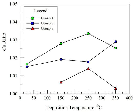 Using Equation (2) the c/a values have been calculated for the films shown in Table 1 in samples where the intensities of the (111) and (200) peaks were sufficient enough to calculate values for the respective lattice constants. The results are shown in Figure 3, where the c/a ratios vary from 1.007 to 1.033. If we consider the error in the XRD peak angle measurement to be ±0.1°, the corresponding c/a range can be determined. Using sample G2-250 as an example, where the measured position for the (111) peak is 38.25°-2θ, we expect the (200) peak at 44.46° ± 0.1°-2θ, which gives c/a = 1.000 ± 0.003. Therefore, for most cases in Figure 2, the c/a values are well above that possible from errors in peak angle measurements. While the data in Figure 3 shows some scatter, two trends can be noted: first, the c/a ratios tend to increase with deposition temperature, and second, lower c/a ratios are generally obtained for higher Ti (and nitrogen) concentrations in the films. XRD results presented in the work by Kappaganthu and Sun [25] similarly showed that the degree of lattice distortion in deposited stainless steel/nitrogen films was reduced with increased nitrogen content, and when near stoichiometric nitrogen levels were reached an undistorted fcc lattice was obtained. In that case, higher nitrogen contents in the films were obtained by increasing the N-partial pressure in the sputtering gas (75% N, 25% Ar), whereas in our case the nitrogen was increased by alloying the films with Ti.