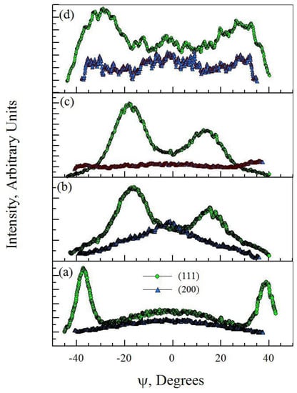 (111) and (200) rocking curves for the films in Group 4, with ψ values ranging from −50° to +50°. Deposited films are: (a) G4-RT; (b) G4-150; (c) G4-250 and (d) G4-350.