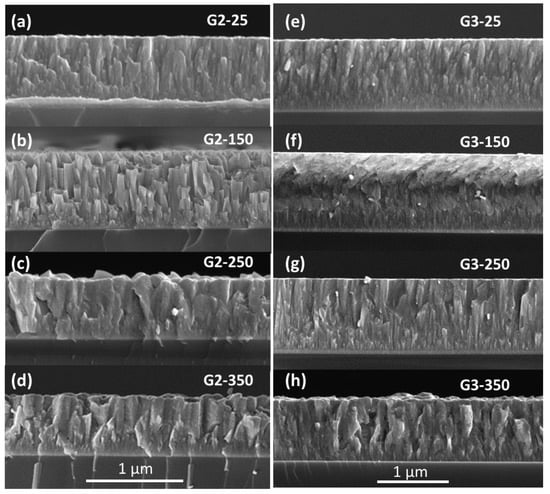 SEM cross-section secondary electron images for films deposited from groups 2 and 3. Films shown in (a–d) are from group 2, and show the development of coarse, faceted crystals with rough film surfaces. Films in (e–h) show improved film density with smoother surfaces, although some coarsening and roughening is observed at 350 °C.