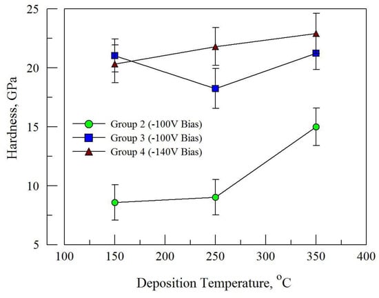 An initial assessment of film hardness was made using Knoop micro-hardness testing. For films in group 1, results were similar to those obtained for films without Ti [28], with hardness levels in the range of 1000–1500 kg·f/mm2. However, the lower thickness for films in groups 2–4 required the use of nano-indentation, the results shown here focus on the films deposited in the 150–350 °C temperature range in groups 2–4. With nano-indentation, the appropriate load was selected so that the indentation depth did not exceed 10% of the film thickness. The results of the nano-indentation tests are shown in Figure 7. Films in Group 2 showed the lowest hardness, and also corresponds to the lowest (7.7 at.%) titanium and nitrogen (43.4 at.%) concentration for the three groups shown in the figure. For films in Groups 3 and 4 the hardness values ranged from 18 to 23 GPa. While the Ti concentration for these groups is similar (12.3 for Group 3 vs. 11.4 for Group 4), the higher bias in Group 4 samples (−140 V) provided higher hardness in the 250 °C and 350 °C samples. The hardness values obtained for these latter 2 groups are generally typical for transition metal nitrides [20,31] and are significantly higher than previously reported levels for nitrided stainless steels [3,10] and stainless steel-nitride thin films [21,28]. The reduced modulus values for these samples were in the range of 221–260 GPa.