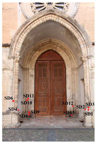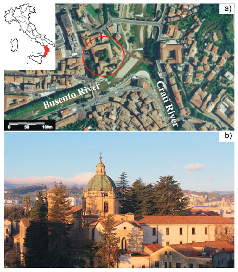 This historical monument is located in the old town of Cosenza (Calabria, southern Italy) and belongs to a Dominican complex dating back to the fifteenth century. Geographically it is placed to the left-side of the Crati river, near its confluence with the Busento river (Figure 1). This complex represents one of the most important historical buildings of the city, with an initial Gothic architectural influence that has undergone stylistic changes over time, especially during the Renaissance and Baroque periods. The church, as the central unit of the whole complex, reflects the typical features of the mendicant orders with a single rectangular room covered by a wooden ceiling and a quadrangular choir overhung by a ribbed vault [14,15]. The façade is composed of three parts: (a) the pediment (no longer visible) with the tympanum, (b) the rose window and (c) the prothyrum with a sixth-acute arch and denticular cornice. The main portal, which, along with the prothyrum was selected as the case study (Figure 2), is made up of calcarenite and characterised by a sixth-acute arch composed of large trapezoidal ashlars, with the exception of the triangular-shaped ashlar-key, and springers with a rectangular section. The arch is framed by a geometrical molding, alternating with shaped bands of rod, strip and inverted throat [14,15].