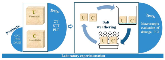 The workflow of the whole laboratory experimentation reporting the specimens list along with details on formulations and used methods is summarized in Table 2 and Figure 3. The experimentation consists of several phases: (a) specimen consolidation, (b) characterization of the formulations after application on the specimens, (c) salt weathering test on untreated and treated specimens to evaluate resistance to salt crystallization.