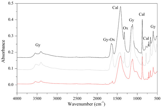 Calcite and quartz occur due to substrate, while the presence of gypsum can represent a degradation product. In fact, if calcium carbonate is attacked by sulphuric acid generated by the sulphur compounds in the polluted atmosphere, it is transformed into gypsum [29,30,31,32,33,34]. Spectra of the samples SD8, SD11 and SD13 exhibit all the previous bands; and in addition, those related to the presence of the characteristic bands of weddellite (calcium oxalate) peaked at around 1643, 1330 and 783 cm−1. The presence of this mineral is indicative of an alteration product [30,31,35,36]. Representative IR spectra are shown in Figure 5.