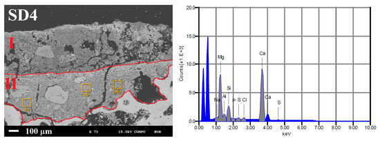 From a chemical point of view, the EDS analyses reveal the similar composition in both layers, both for SD4 and SD9. In particular, the peaks of S and Ca can be attributable to gypsum, as characteristic component of the black crusts. On the contrary, the detection of other chemical elements such as Mg, Al, Si, Na, Cl could be related to the accessory mineralogical phases in the stone substrate and to the soluble salt crystallization (Figure 5). Five measurements were performed for each investigated sample and the average value was considered as representative of the chemical composition.