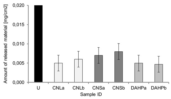 The Scotch tape test (SST) was performed to provide information on the superficial cohesion of stone in order to investigate better the mechanical features of treated samples and to correlate them with those untreated. The results are reported in Figure 7. Treated specimens show a decrease in released material compared to untreated specimens, achieving an improvement in their superficial cohesion. Also, specimens treated with greater quantities of product give a better result. In more detail, a greater efficacy in terms of increased cohesion properties was observed in the samples treated with a mixture of nano calcium-hydroxide and diammonium hydrogen phosphate.