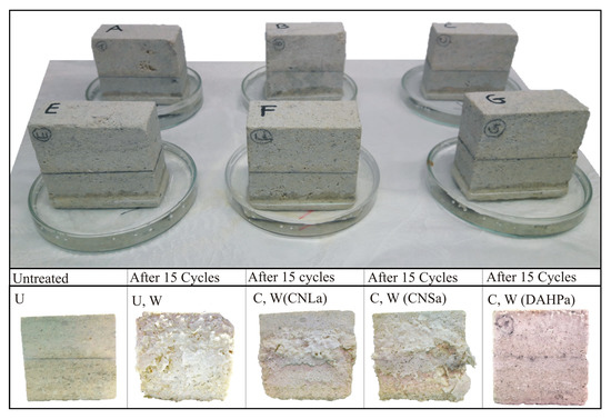 Salt weathering of some representative “San Lucido” stone specimens. Note: U, untreated; C, consolidated; W, weathered; CNL, CaLoSiL®; CNS, Nano Estel®; DAHP, Mixture of Ca(OH)2 and diammonium hydrogen phosphate.