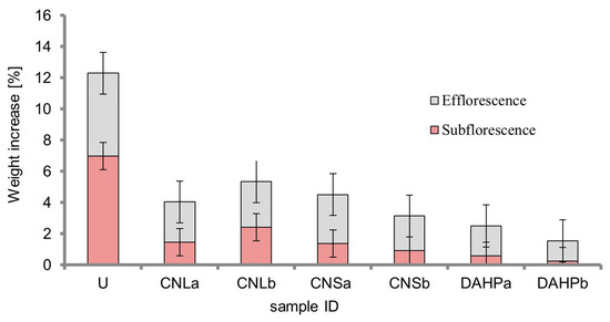 Weight increase (%) after salt crystallization test with evidence of the contribution of efflorescence and subefflorescence.