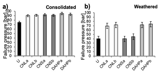 Figure 10 reports the failure load values for analysed samples. Tests were carried out on untreated, consolidated and salt-weathered specimens (after 15 cycles). The unaltered material (U) (Figure 10a) reaches a failure pressure slightly higher than 70 bar, while consolidated specimens a pressure ranging from about 90 to 95 bar, suggesting an increase of the material strength after the consolidating treatment. As for the same test, performed after 15 cycles of salt crystallization (Figure 10b), results show that weathered stones have a failure pressure respectively of: 40–45 bar for specimens treated with nanosilica (i.e., CNS, Nano Estel®), 70–72 bar for specimens treated with nanolime (i.e., CNL, CaLoSiL®) and 72–75 bar for those treated with a mixture of nano calcium-hydroxide mixed with diammonium hydrogen phosphate (i.e., DAHP). Moreover, the untreated and aged specimen shows a decrease in the failure pressure (40–70 bar).