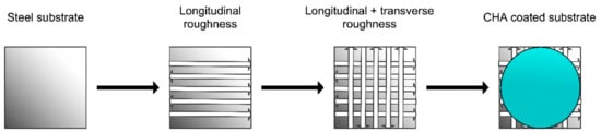 For the sol-gel processing, calcium acetate monohydrate (Ca(CH3COO)2·H2O; 99.9%; Fluka, Saint Louis, MO, USA, 5.2854 g (0.03 mol)) was dissolved in 40 mL of distilled water and mixed with 4 mL of 1,2-ethanediol (99.0%; Alfa Aesar, Haverhill, MA, USA). Then, a mixture of ethylenediaminetetraacetic acid (EDTA; 99.0%; Alfa Aesar, Haverhill, MA, USA, 9.6439 g (0.033 mol)) and triethanolamine (99.0%; Merck, Darmstadt, Germany, 24 mL) was added to the solution, which was continuously stirred for 10 h. Next, phosphoric acid (H3PO4; 85.0%; Reachem, Manhattan, NY, USA, 1.23 mL) was added with stirring for about 24 h. Finally, the obtained sol-gel solution was mixed with 3% solution of polyvinyl alcohol (PVA7200, 99.5%; Aldrich, Saint Louis, MA, USA) in the proportion 25 to 15 mL. This solution was used as sol-gel precursor solution for the synthesis of CHA coatings on prepared 316L stainless steel substrate. The surface of square plates of 10 mm × 10 mm × 0.5 mm was modified by formation of transverse and longitudinal patterned roughness (less than 0.2 µm) prior to the spin-coating of the Ca–P–O sol-gel solution (0.5 mL). A sandpaper (2500 grit) was used to obtain the pattern. Two pieces of sandpaper were lightly rubbed against each other to remove any possible large particles to protect the surface from gouging. Then the metal was roughened with the sandpaper applying medium pressure from an index finger.in two directions 90° apart. A schematic diagram of the preparation of the CHA coatings is presented in Figure 1.