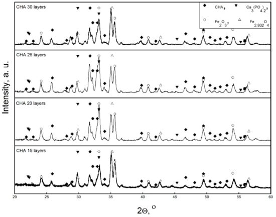 The multilayer coatings were obtained by increasing the number of spinning and annealing cycles from 15 to 30. The dependence of CHA formation on the times of spinning and annealing is evident. With 15 spinning and annealing procedures, iron oxides (Fe2O3 and Fe2.932O4) were the dominant crystalline phases. The iron oxide phase was formed by heating an uncoated but roughened stainless steel substrate at the same temperature (see Figure 3).
