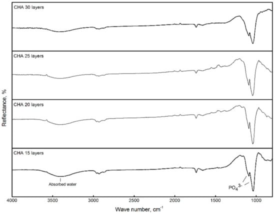 The FTIR spectra were almost identical among all the samples with various number of layers. The characteristic calcium hydroxyapatite absorption bands in the range of 1100–950 cm−1 were clearly visible [32]. Strong bands located at 1035 and 1090 cm−1 resulted from the ν1 symmetric P–O stretching vibrations in PO43− [32,33]. The broad band visible in the range of 3600–3300 cm−1 is associated with O–H stretch vibrations and attributed to adsorbed water [29,32,34]. In all spectra, weak and broad bands in the range of 1550–1370 cm−1 were also seen. The origin of these bands is related to the stretching and bending modes of CO32− in CHA (C–O bond), despite the last band being slightly shifted to the region of lower wavenumbers. The existence of low-intensity bands at about 870 cm−1 may be ascribed to the ν2 bending mode of CO32− (C–O bond) in CHA and confirmed the presence of carbonated apatite in the samples [32]. No specific bands attributable to oxyhydroxyapatite Ca10(PO4)6(OH)2−2xOx were detected in our spectra; however, such bands were present for the CHA thin films deposited on Si substrate [35].