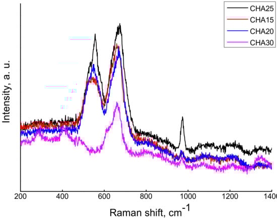 Figure 5 shows Raman spectra in the 200–1400 cm−1 spectral region of the CHA samples deposited on rough stainless steel substrate.