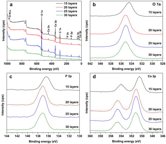 XPS survey spectra (a) and high-resolution O 1s (b), P 2p (c) and Ca 2p (d) XPS spectra taken from the surface of deposited and annealed CHA films with different numbers of layers.
