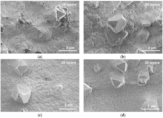 SEM micrographs of the CHA samples containing (a) 15, (b) 20, (c) 25, and (d) 30 layers. Magnification 15,000.