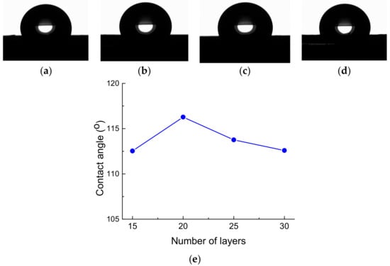 Variation of contact angle of CHA coatings with increasing number of layers (e) and the images of water drops on CHA surfaces coated with (a) 15, (b) 20, (c) 25, and (d) 30 sol-gel layers.