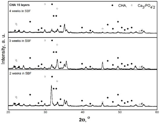 XRD patterns of CHA samples coated with 15 layers after immersion in SBF for 2, 3, and 4 weeks.