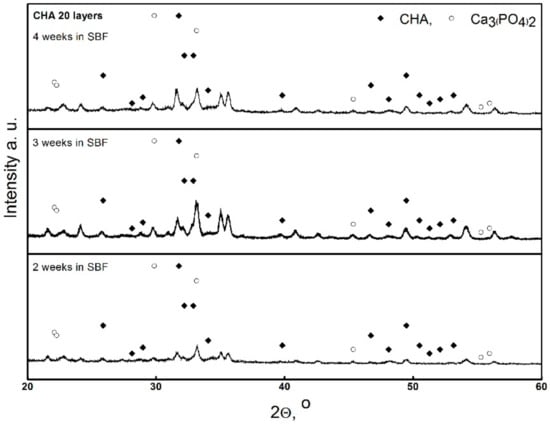 XRD patterns of CHA samples coated with 20 layers after immersion in SBF for 2, 3, and 4 weeks.