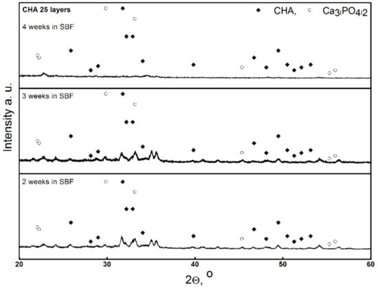 XRD patterns of CHA samples coated with 25 layers after immersion in SBF for 2, 3, and 4 weeks.