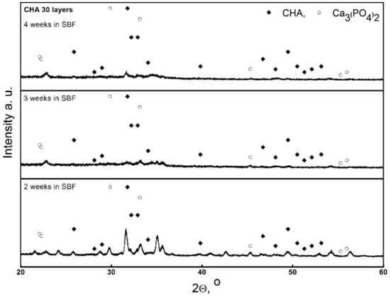 All CHA samples were immersed into simulated body fluid (SBF) for one month. The phases and morphology were examined after 2, 3, and 4 weeks. The XRD patterns of the CHA samples with 15, 20, 25 and 30 layers after immersion into SBF for 2, 3 and 4 weeks are presented in Figure 10, Figure 11, Figure 12 and Figure 13. Once placed into SBF, TCP starts to dissolve and induce formation of amorphous calcium phosphate (ACP) and precipitation of CHA. However, the amount of precipitated ACP and CHA is probably too small to be detected using XRD [42]. ACP is the precursor phase of bone-like hydroxyapatite [43]. Loss of crystallinity due to lower peak intensity is visible in Figure 10 and Figure 11 for samples with 15 and 20 layers respectively.