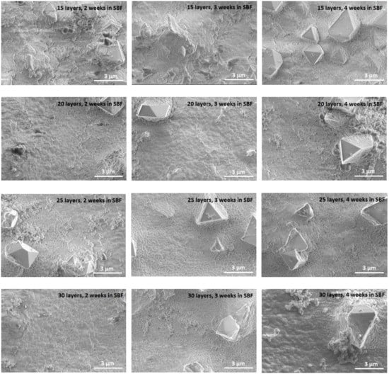 The SEM micrographs of the CHA samples with 15, 20, 25, and 30 layers obtained after immersion into SBF for 2, 3, and 4 weeks can be seen in Figure 14.