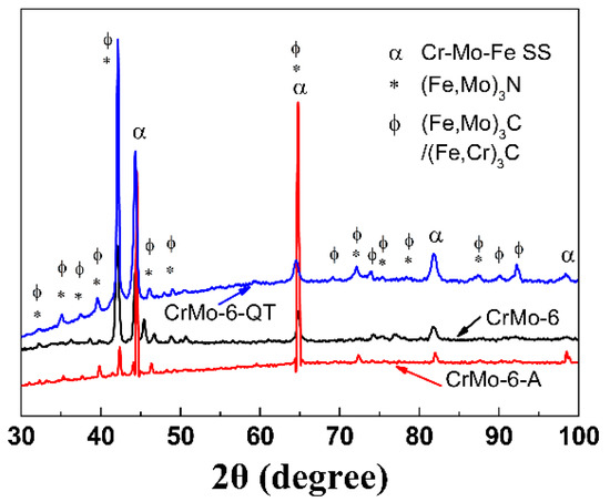 Figure 1 shows the XRD patterns of the samples before and after different heat treatments. Phases are identified from the XRD patterns using the International Center for Diffraction Data (ICDD) database. After DGPSA treatment, the coatings in the CrMo-6 sample consist mainly of an α-Fe solid solution (Fe–Cr–Mo SS) containing Cr and Mo atoms and a small amount of nitride ((Fe,Mo)3N). The DGPSA chamber is filled with high-purity nitrogen gas. It is easy to generate nitrogen ions under the action of glow discharge. The nitrogen ions then react with the Mo atoms and Fe atoms from the source target and the matrix at high temperature, thereby forming the nitride. After annealing, the coatings consist mainly of Fe–Cr–Mo SS (see CrMo-6-A in Fig. 1), but the intensity of the peak is significantly enhanced owing to the coarsening and preferred orientation of the coating grains during annealing. It is known that the grain growth and formation of crystallographic texture will enhance the XRD peak intensity [22,23]. It is well known that Cr and Mo elements act as medium carbide-forming elements, and carbides are easily formed at high temperature [15,16]. The indexing of carbides is very difficult because of their wide range of stoichiometry and the ICDD database is not sufficient to clearly identify all peaks [24]. Nevertheless, after Q&T, in addition to the two phases of Cr–Mo SS and nitride, the presence of carbide ((Fe,Mo)3C or (Fe,Mo)3C) is also detected in the CrMo-6-QT sample. This is because the Cr and Mo elements are medium carbide-forming elements and easily form carbides at high temperatures [15,16].