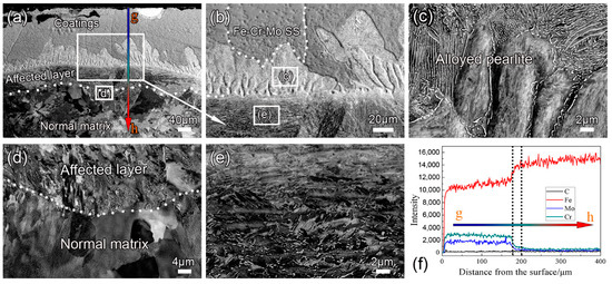 Figure 2 shows the cross-sectional views of the microstructure at various scales of the CrMo-6 sample. The gradient microstructure consisting of the coatings, affected layer, and the normal matrix is clearly visible in the depth direction. The coating thickness is measured as about 180 μm. The enlarged view shows that the coatings are composed of a coarse columnar grain and pearlite structure. The EDS line scanning spectrum shows that the outermost layer of the coating has high Fe, Cr, and Mo, and the Fe/Cr/Mo atomic ratio is linear, indicating that the outermost layer is the Fe–Cr–Mo SS layer, as shown in Figure 2f. Irregular pearlites are observed at the bottom of the columnar grains (near the affected layer). It has been reported that strong carbide-forming elements can drag out C atoms from the steel substrate and form into alloyed cementite at high temperatures [16,25]. The EDS line scanning spectrum clearly shows that these regions contain higher Cr and Mo (between the two dashed lines in Figure 2f) than the normal steel matrix. That is, this region is alloyed pearlite composed of a ferrite phase and cementite containing Cr and Mo, as shown in Figure 2c. However, due to the limited depth of X-ray penetration, these alloy cementites are not detected in the XRD pattern. Owing to the diffusion of carbon atoms into the outer layer of the coating to form an alloy cementite, the carbon content of the subsurface of the original steel matrix is significantly reduced, forming the affected layer with a thickness of approx. 52 μm. Compared to the normal matrix with normal pearlite morphology, the affected layer has less cementite distribution and almost no lamellar cementite (see Figure 2d,e).