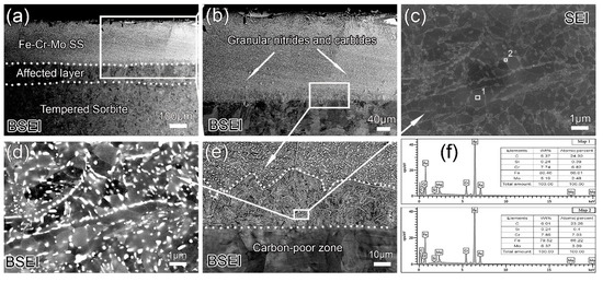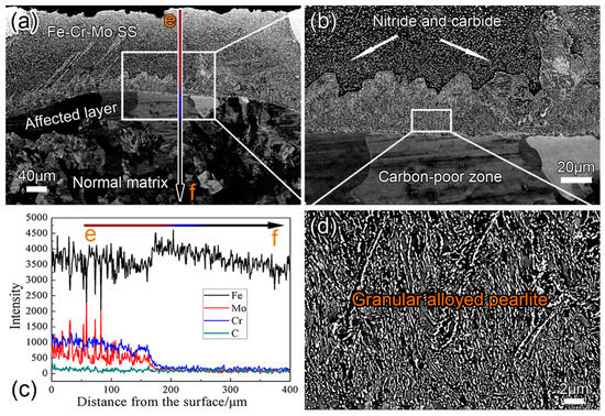 Figure 3 shows BESI of the CrMo-6-A sample. As can be seen, after annealing, the gradient microstructure consisting of the coating, the affected layer, and the normal matrix is still visible. In the coating layer, more nitride and carbide particles are observed in the Fe–Cr–Mo SS region (Figure 3b), and the lamellar alloyed pearlite changes to a granular morphology (Figure 3d). Shtansky et al. [29] reported that M23C6 carbide decomposes into (Fe,Mo)3C+γ in Fe–Mo–C steels, showing a rod-like or lamellar structure. Comparing Figure 3c with Figure 2f, it can be seen that after annealing, on the side of the coating, the element distribution curve is sawtoothed, indicating the formation of carbide precipitation. This is because the precipitates are randomly distributed in the Fe–Cr–Mo SS and the EDS scanning line can only pass several precipitates. The element content is high when the EDS scanning line passes through the precipitates and results in a zigzag distribution of the Cr, Mo, Fe, and C in the EDS line scanning spectra.