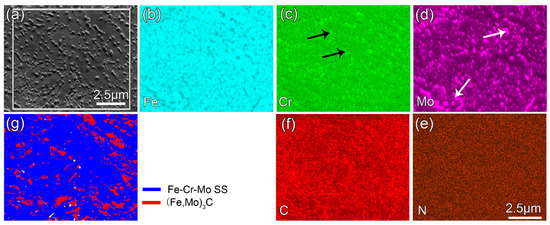 EDS and EBSD maps showing the coating microstructure of the CrMo-6-QT sample are displayed in Figure 5. Figure 5a shows that after Q&T, the coating is very dense and free of microcracks. A large number of particles with an average size of about 200 nm are uniformly distributed in the coating. The EDS results show that such particles are high in Mo and Cr (see Figure 5b,c). Combined with XRD analysis, such granular particles are nitride ((Fe,Mo)3N) and carbide ((Fe,Mo)3C/(Fe,Cr)3C). As discussed above, nitrides are formed during DGPSA treatment, while the carbides with a granular morphology mainly precipitate in the subsequent Q&T. As can be seen from Figure 5f, most nitrides have a rod-like shape with an average diameter of about 350 nm. In addition to (Fe,Mo)3C with a relatively large size (see white arrows in Figure 5d), some (Fe,Cr)3C carbides with a smaller size (see dark arrows in Figure 5c) are formed in the coating. Due to the limitation of the spatial resolution of the EBSD, such (Fe,Cr)3C carbides with a small size cannot be identified by the EBSD mapping.