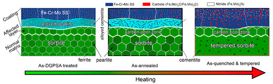 - After annealing or Q&T, more carbides precipitate in both the Fe–Cr–Mo SS layer and the alloyed pearlite layer. All the C atoms in the subsurface are dragged into the coating to form the carbides in the Fe–Cr–Mo SS and the alloyed pearlite layers of the coating, resulting in the conversion of the affected layer into a carbon-poor zone.