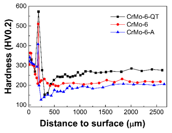 Figure 7 shows the microhardness distribution along the depth direction of various samples. It can be seen that the hardness distribution of the three different samples follows almost the same change, and the hardest position (about 500 HV0.2) is located at the subsurface of the coating. That is because in the coating, Cr and Mo are dissolved in the α-Fe solid solution to cause solution strengthening, and the distributed carbide and nitride particles can cause dispersion strengthening. Moreover, the subsurface layers of the three samples contain the highest carbides (alloy cementite) (see Figure 2c, Figure 3c, and Figure 4d, respectively), resulting in the greatest dispersion strengthening effect. Compared to the as-DGPSA treated state (about 350 HV0.2), the hardness of the outermost layer does not change significantly after annealing or Q&T. The hardness of the subsurface layer decreases to about 400 HV0.2 after annealing but increases to about 580 HV0.2 after Q&T. It is apparent that annealing results in grain and second phase coarsening, while Q&T can precipitate more alloyed carbides and refine the grain size, resulting in annealing softening and hardening of Q&T. Moreover, owing to the presence of tempered sorbite, the hardness of the steel substrate is greatly increased after Q&T in comparison with the as-DGPSA treated state and the annealed state.