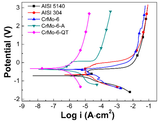 The polarization curve reflects the relationship between the electrode potential and polarization current and is an important method for studying the electrode process dynamics and electrochemical corrosion principles [31]. The anodic polarization curve is a relationship between the anode potential and the current when the metal anode is dissolved. A large number of studies [32,33,34] have shown that Cr-coated or Mo-coated steels have excellent corrosion resistance. Figure 8 shows the polarization curves of different samples. The corrosion parameters are shown in Table 2, where the corrosion rate was calculated by the Faraday Equation [35]: