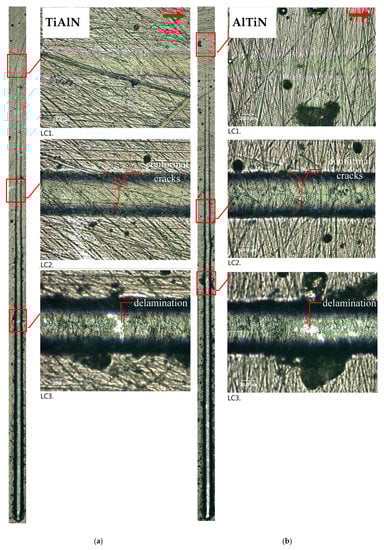 Scratch traces: (a) TiAlN; (b) AlTiN and enlarged characteristic areas of Lc1, Lc2 and Lc3. (total scratch trace 3 mm), scratch direction marked by an arrow.
