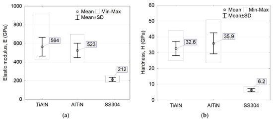 In Figure 5, it is clearly visible that the AlTiN and TiAlN coatings have comparable elastic modulus and hardness, in the range of standard deviation. The H and E values are within the result range reported in the literature [,,,]. Nevertheless, AlTiN exhibits higher H/E and H3/E2 ratios than TiAlN, which can be attributed to its higher Al content. Furthermore, the E and H of both films exceed those estimated for the SS substrate.