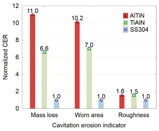A promising method for the ternary films CER identification is to analyze mechanical properties, especially the E/H and H3/E2 ratios estimated before cavitation (Table 3). According to the literature [,,,,], the susceptibility of a material to elastic strain to failure is expressed by the H/E quotient as well as its resistance to plastic deformation defined by the H3/E2 ratio. Higher H/E and H3/E2 ratios mean that the films exhibit highly elastic behavior and high resistance to plastic deformation [,,,]. The high value of the H3/E2 coefficient is primarily attributed to fracture toughness of thin films. The AlTiN film has a higher H3/E2 ratio than the TiAlN film. In other words, the AlTiN coatings are considered to be more resistant than TiAlN, and hence much more resistant to cavitation erosion. This observation is in accordance with the normalized CER results, Figure 6.