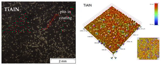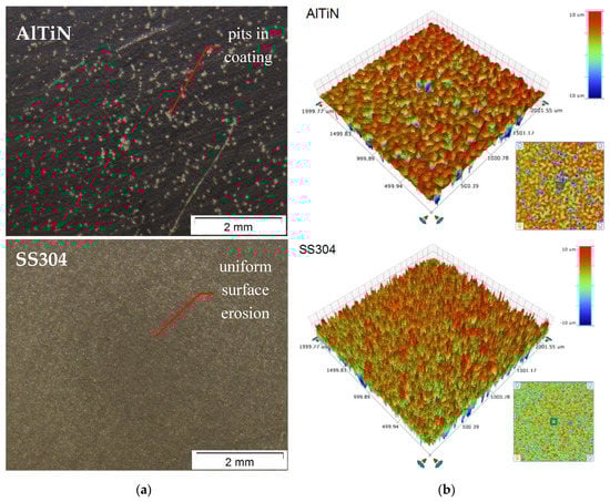 In general, the comparison of the worn surfaces agrees with the quantitative data presented in Figure 6. As a result of cavitation, the sample surfaces are randomly degraded due to the impact of micro-jets or shock pressure waves [,,]. The TiAlN coating is severely more damaged and shows the presence of more pits in its structure than the AlTiN film (Figure 7a). In addition, the observed surface non-uniformities such as “scratches”, resulting from substrate preparation, act as surface notches accelerating substrate-perpendicular cracking of the film and its rupture. Nevertheless, both films are less eroded than the reference sample. The roughness parameter Sa estimated for the damaged surfaces of TiAlN, AlTiN and SS304 is 1.5 µm, 1.4 µm and 2.3 µm, respectively (Figure 7b).