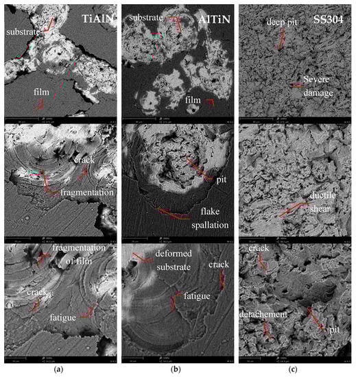 A survey of the literature reveals that there are few studies that compare the properties of TiAlN or AlTiN coatings in relation to their CER, and investigate the CE wear mechanism of magnetron-sputtered films with reference to an SS substrate. Figure 7a shows a macroscopic view of surface pitting and Figure 7b compares the surface morphology of TiAlN, AlTiN and SS304 surfaces worn by cavitation erosion. The SEM photographs in Figure 8 provide details into cavitation erosion of the tested materials.