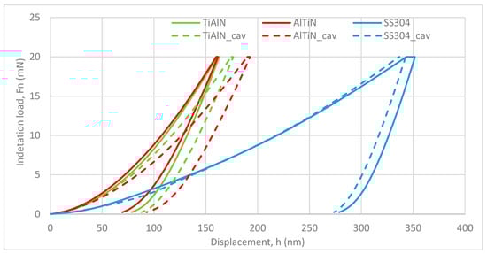 Loading-unloading nanoindentation curves estimated on the films and reference SS304 surface, before and after (marked as “cav”) cavitation erosion tests.