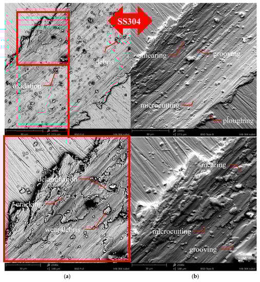 Wear trace on the SS304 sample: (a) SEM-BSD and (b) SEM-topo, 1000× and 2500×.