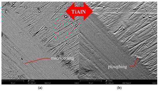 This preliminary study investigates the influence of differences in the chemical composition of AlTiN and TiAlN films on the films wear behavior. Chemical compositions of the films are compared in Table 1, showing that the AlTiN film contains more aluminum and nitrogen than the TiAlN film. Both the Al content and Al/(Ti + Al) ratio play an important role in increasing film mechanical properties [,]. Therefore, the higher average film-to-SS substrate adhesion of AlTiN (Table 2) can be explained by a higher Al content. It can be claimed that the differences in the chemical composition of AlTiN and TiAlN affect the mechanical properties of these films, as well as the substrate–to-film performance and, finally, functional properties such as wear resistance.