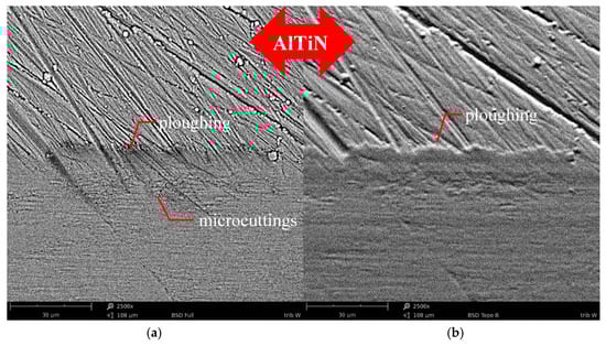 Sliding wear trace: (a) TiAlN; SEM, 15000×. and (b) AlTiN; SEM, 17000×.