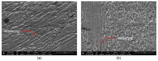 To simulate moderate friction conditions describing mostly limited sliding loads in fluid machinery, the nano-tribo tests were performed with the use of the NTR2 nano-tribometer from Anton Paar GmbH [,]. A WC ball with a 0.5 mm diameter was used as the counterpart. A load of 0.8 N, a sliding distance of 90 m and a sliding radius of 5 mm were applied to the ball. As a result, the friction coefficient µ of individual samples could be determined. Next, the wear trace of individual samples was measured using the Taylor Hobson Form Talysurf Intra profile measurement gauge. The measurements provided profilograms enabling determination of the wear factor K, see []. In addition, obtained wear traces were analyzed with SEM to identify the mechanism of wear.