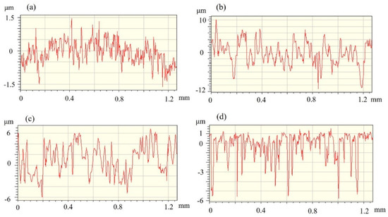 Roughness profiles of surfaces with different treatments: (a) sandpaper abrading, (b) sandblasting, (c) chemical etching, and (d) PAA.