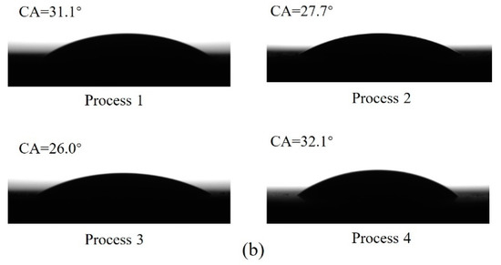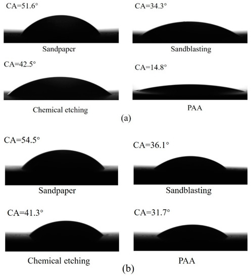 The contact angles of deionized water and FM 94 adhesive on the surfaces created by different treatments were measured, to understand the wettability of surfaces with different morphologies. As shown in Figure 4a, the PAA treated surface has the best wettability with the deionized water contact angle of 14.8°, which is far less than that on the sandpaper-treated surface. FM 94 adhesive is a room-temperature solid epoxy; the contact angles of the fully molten adhesive can be obtained stably and accurately at a high temperature of approximately 115 ± 3 °C, as shown in Figure 4b. It can be seen from Figure 4 that the difference of the adhesive contact angels is smaller than that of water contact angles, which may be attributed to the high viscosity and poor mobility of the adhesive. However, the PAA treated surface shows the best penetration of the adhesive; the adhesive contact angle is the smallest at 31.7°.