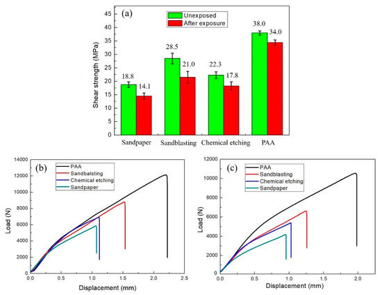 Figure 5 shows the strengths of joints with different surface morphologies before and after hot-humid exposure. As can be seen, the strengths of all the joints decrease after the exposure; however, the amounts of the decrease differ significantly among the various surface morphologies. The PAA-treated samples exhibit the best initial strength and environmental durability, with strength deterioration of 10.5%. The chemical etching treated samples show 20.1% strength degradation. However, the sandpaper-abraded and sandblasted samples show lower durability, with strength decreases of 25% and 26.3%, respectively. The results indicate that the initial strengths and durability of joints are both affected by the surface morphology of the substrates, and that the porous structure produced by PAA positively affects the bonding adhesion and durability. Figure 5b,c show the load-displacement curves of joints obtained before and after exposure, demonstrating that the strengths and displacements are decreased after hot-humid exposure.