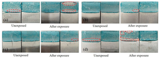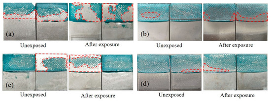 Effect of surface roughness by combined treatment on failure modes after exposure: (a) process 1, (b) process 2, (c) process 3, and (d) process 4.